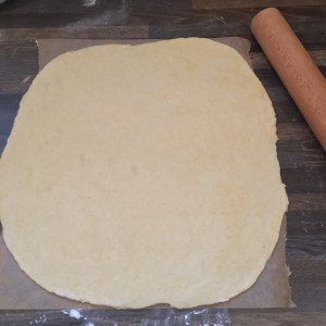 Fariner votre plan de travail, ou une table, puis étaler votre pâte, le plus carrée que possible. Poser votre pâte sur une feuille de papier cuisson.