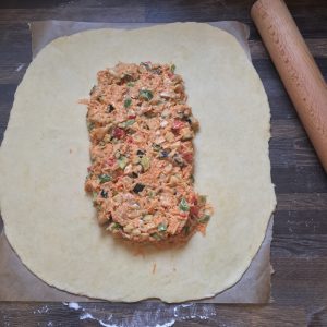 Placer l’ensemble des ingrédients au milieu de votre pâte dans la forme d’un rectangle.